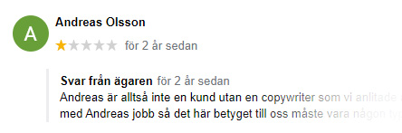 Vid dåliga recensioner är det extra viktigt att svara. Ett bra svar kan vända en dålig recension till något positivt, kanske att vi även kan få kunden att ta bort eller ändra sin recension. Vi kan även rapportera olämpliga recensioner som strider mot Googles policy.